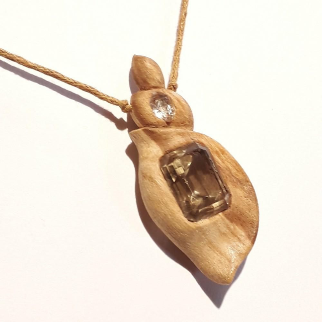 Magic Amulet with Faceted Golden Quartz, Herkimer Diamond and Hand Carved Palo Santo Wood